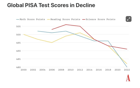 Let’s look at educational outcomes for children since 2012, the outset of the “digital revolution” in our schools. The test scores are dismal and getting worse around the world. 11 Here is what “progress” in 38 countries looks like:
